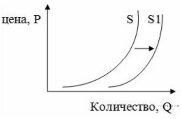На рисунке изображена ситуация на рынке цветов: линия предложения S переместилась в новое положение S1 (P – цена цветка, Q – количество предлагаемых цветов). Это перемещение может быть связано в первую очередь с