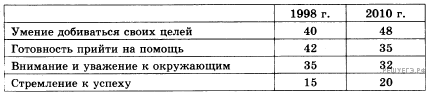 В стране Z социологическая служба проводила опросы для выявления качеств, которые родители хотели бы воспитывать в своих детях. Отдельные результаты опроса приведены в таблице (в %; участники опроса могли выбирать несколько ответов).