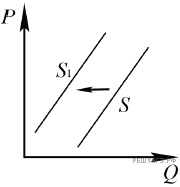 На рисунке отражено изменение предложения школьно-письменных принадлежностей на соответствующем рынке: линия предложения S переместилась в новое положение — S1. (P — цена товара; Q — количество товара.) Это перемещение может быть связано, прежде всего, с