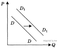 На рисунке отражены изменения спроса на легковые автомобили на соответствующем рынке: линия спроса D переместилась в новое положение D1 (P — цена товара, Q — количество товара). Это перемещение связано, в первую очередь, с