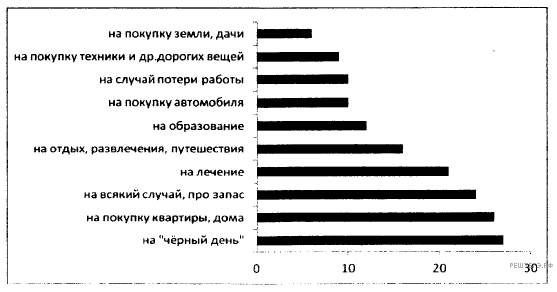 «Для каких целей Вы (Ваша семья) делаете сбережения или стали бы делать, если бы у Вас была возможность?» Ответы на данный вопрос были получены в ходе опроса, проведенного ВЦИОМ в 2014 году. Каждый опрошенный мог выбрать не более трех ответов из числа предложенных. Основные результаты опроса приведены в диаграмме (в %).