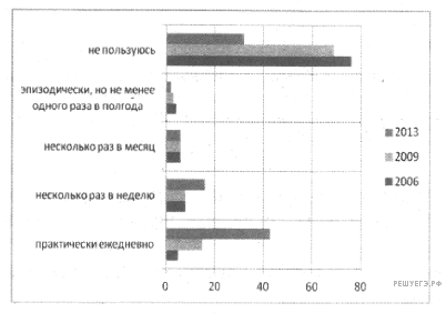 «Пользуетесь ли Вы Интернетом, и если да, то как часто?» Ответы на данный вопрос были получены в ходе опросов, проведённых ВЦИОМ. Их результаты приведены в диаграмме.