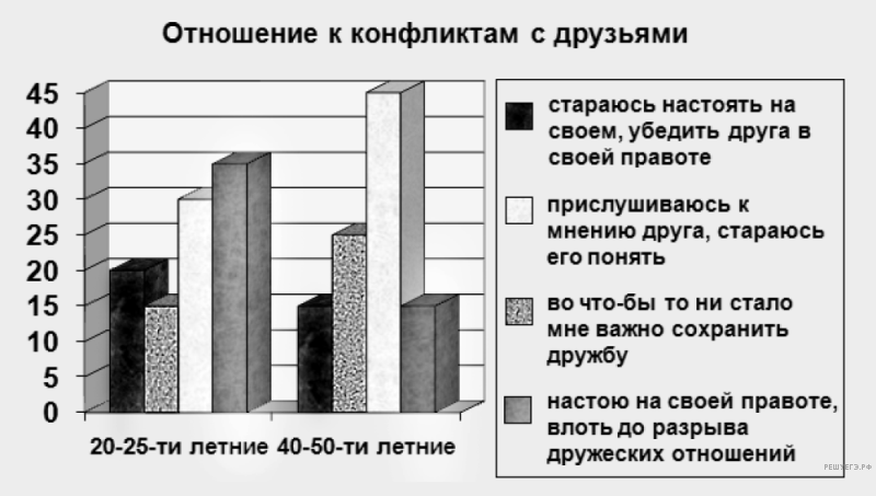 Нередки ссоры и конфликты между друзьями, связанными узами многолетней дружбы. Ученые-социологи опросили две группы людей (20–25-ти лет и 40–50-ти лет), задав им общий вопрос: «Как вы обычно поступаете, если у вас с вашим другом, близким человеком произошла ссора?»
