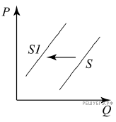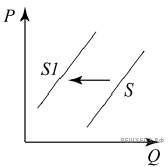 На рисунке изображена ситуация на рынке цветов: линия предложения S переместилась в новое положение S1 (P — цена цветка, Q — количество предлагаемых цветов). Это перемещение может быть связано в первую очередь с