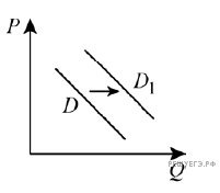 На графике изображено изменение спроса на спортивные тренажёры для использования в домашних условиях: кривая спроса переместилась из положения D в положение D1. (На графике P — цена товара; Q — количество товара.)