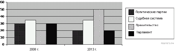 В стране Z в 2010 и в 2013 году проводились опросы среди совершеннолетних жителей на тему: «в какой степени Вы доверяете различным политическим институтам?». Результаты опроса представлены в диаграмме.